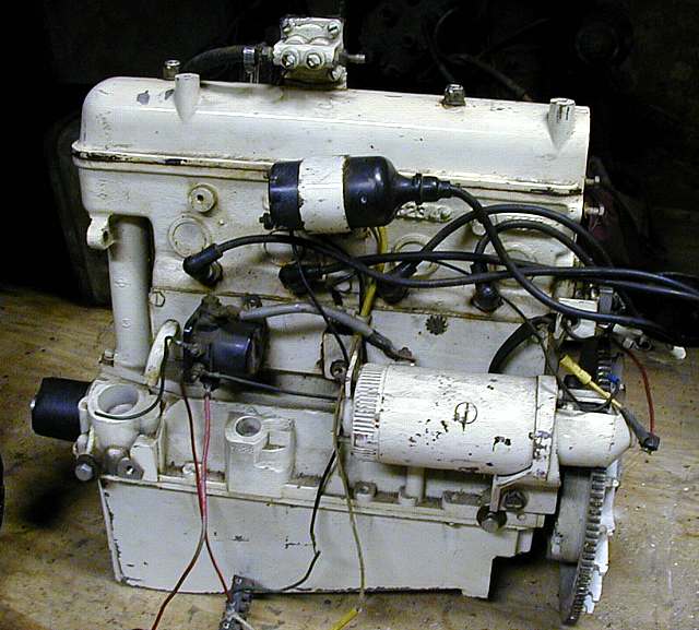 Big Block CrosleysThe term big block Crosley is starting to be used as some of these late boat engines are converted in to car engines and put into Crosleys. Normally they are referring to the 59 cu. in. blocks. The 53 cu. in. Crofton also qualifies but very few have shown up. The big blocks have a 2.75" bore instead of the normal 2.5". To get this larger bore the block casting was modified, forging the cylinders together to get more wall thickness, without changing the crankcase mounts and normal geometry of the engine. The stroke was increased to get the other 6 cubic inches to make 59 CI.A quick way to tell if you have a big block engine is to look at how the block mounts to the crankcase. If the block is held to the crankcase by nuts it is a small bore, on the large bores there isn't room for nuts, studs screw into the block from below. |