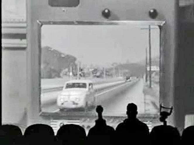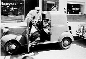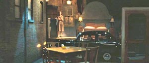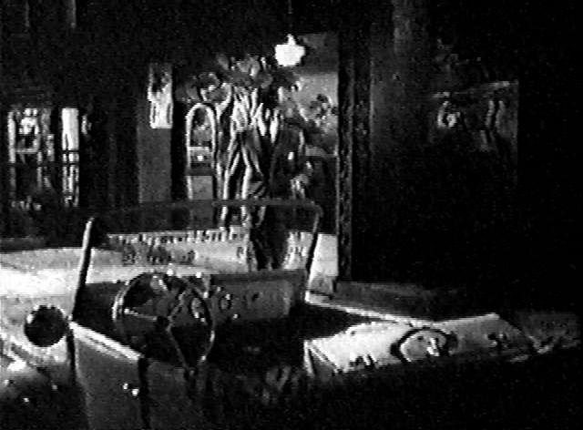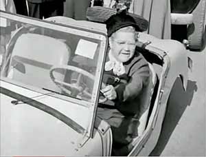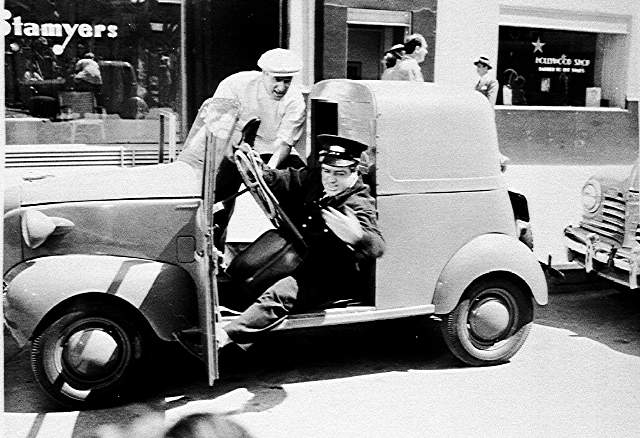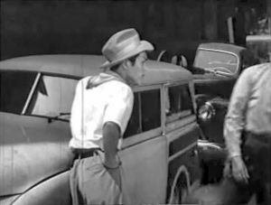 Ball" (1943): Later at a shooting gallery, Ray comes back to his car to find a lipstick message on the windshield. Later in the film Ray pulls onto a nighttime highway without looking and sideswipes a watermelon truck, and dozens of watermelons spill into the open Crosley, one of which knocks Ray out. (I don't think the vehicles actually touched.) The next day there's a newspaper article telling of the accident, saying that Ray was "driving his interim wartime vehicle". |