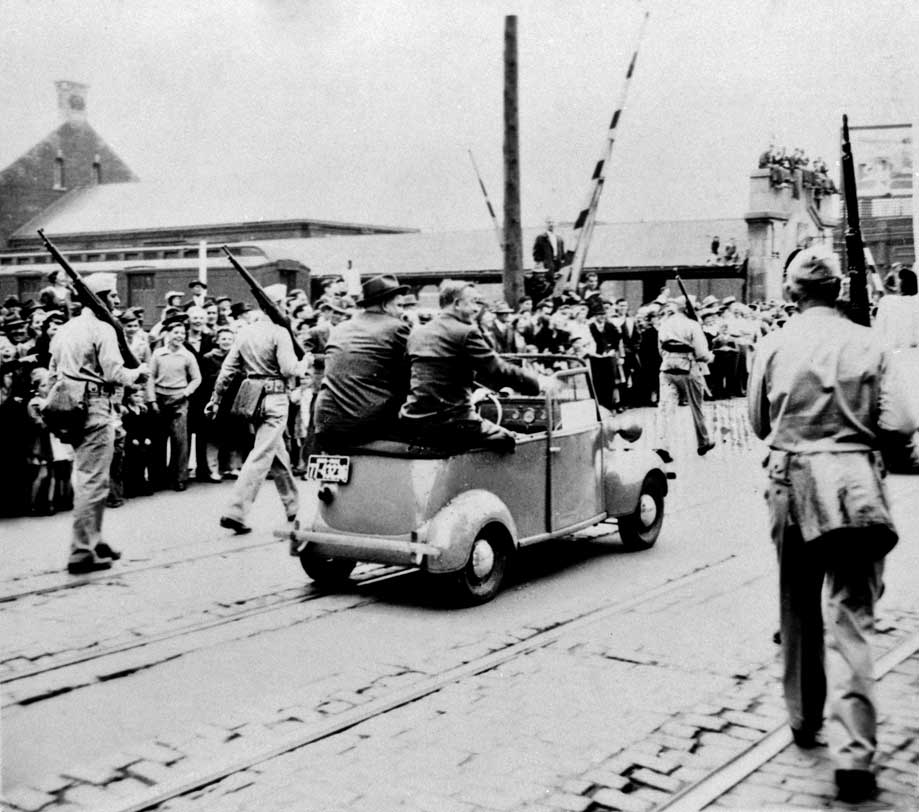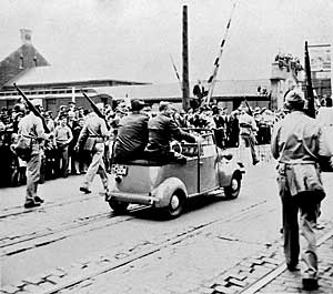| "War Bond Newsreel" (1942) Stan Laurel and Oliver Hardy during a War Bond parade, sitting up on the rear body ledge. The newsreel was made in Des Moines in 1942. A Des Moines Tribune photographer was on hand and shot a photo for the paper. Till we can find a copy of the Newsreel, I have an amateur photo also taken at the event as a place holder? |