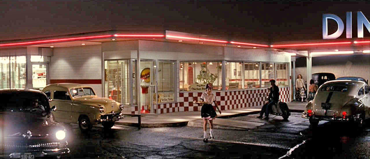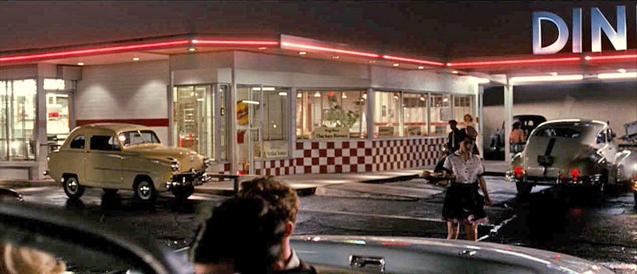 Only" (2009): Taking place in 1953 a self-absorbed woman leaves her philandering band-leader husband and takes her two teen-aged sons across the country, searching for a new husband. Lots of nice vintage cars and trucks including a 1951-52 yellow Crosley sedan sitting by a drive-in restaurant. The Crosley got a fair amount of background time about 23 min 30 seconds into the movie. 3 frames from the scene to the right, notice the car hop on rollerskate. |