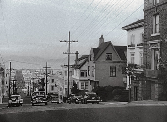 Warning!" (1952): Quiet, unobtrusive LA citizen Carl Martin picks up look-a-likes for his estranged blonde wife and murders them with garden shears. What looks like a 1949-52 Wagon driveing by in background. |