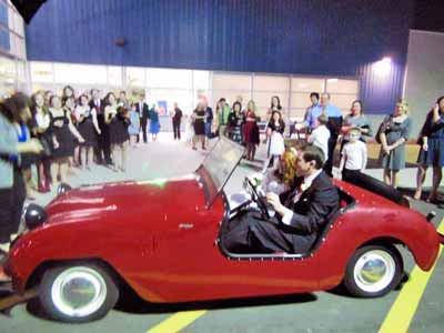 "My son requested to use My 1949 Hotshot as his get-a-way car at his wedding tonight. The Crosley was a big hit. Everyone raved over the Hotshot. The official photographer even followed along side sitting on her car window sill to get a good shot of the couple driving away. The bride was still in her wedding dress of course. Good contrast with the red car." |
